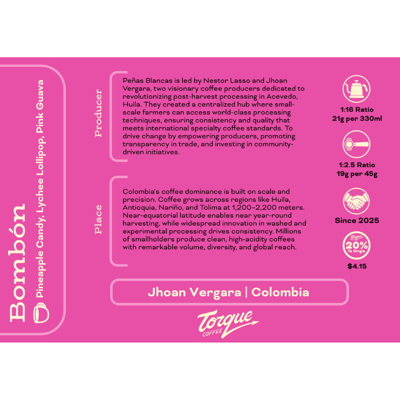 BomBón is our first custom coffee from the dynamic duo that lead the Peñas Blancas coffee mill project in Colombia. Jhon Vergara and Nestor Lasso have made a worldwide name for themselves with radical experimental coffee processing. Their coffees have been winners in every global coffee, barista and roasting competition for years. They have achieved great success in bringing anaerobic, yeast and fruit inoculated and co-fermented coffees to market.